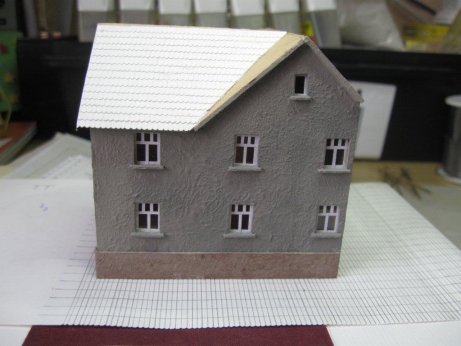 Das Herstellen derselben ist zwar eine sehr langwierige und recht eintönige Angelegenheit, aber ich habe mich entschieden, meine Dächer in der eigenen Werkstatt selbst herzustellen. Dazu habe ich auf Papier mit einem Grammgewicht von ca 100g/m2 (das ist etwas dicker als normales Druckerpapier) im Abstand von 1,5mm Linien aufgezeichnet, die anschließend mit einem nicht zu scharfen Messer eingeritzt werden (nicht durchschneiden). Anschließend schneide ich das Papier mit einer kleinen Schere zuerst von einer, dann von der anderen Seite kurz ein. Es ergibt sich ein gezacktes Bild, welches aus kurzer Entfernung sehr ?dachziegelähnlich? aussieht. Dann schneide ich 5mm Streifen und klebe sie auf die Dachfläche aus Sperrholz. Der nächste Streifen folgt um einen halben Ziegel versetzt. Es ergibt sich ein plastisches Aussehen, die vorhandenen Unregelmäßigkeiten verstärken diesen Eindruck noch. Ergänzt wird das Dach dann noch mit Firstziegeln und Dachrinnen von Auhagen, die vor dem Aufkleben zwecks besserer Farbhaftung sorgfältig mit Spülmittelwasser gereinigt werden. Hier ist der Selbstbau nicht notwendig, weil diese Dinge nicht mehr besser dargestellt werden können. Die Farbgebung erfolgt mit Wasserfarben, wobei immer nass in nass mit unterschiedlichen Farbtönen gearbeitet wird. Die Farbe sollte dabei nicht zu dick sein, weil ansonsten die eingeritzte Struktur verloren geht.