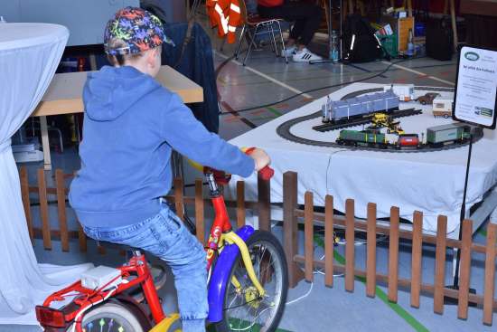 Das zweite Ausstellungswochenende begann mit einer Abmeldung. Pirmin war krank, also hatte ich keinen Helfer an meiner Anlage, denn insgesamt waren wir nur zu fünft. Als letzter Neuling an der N-Anlage wurde noch Achim angelernt. Als „Großbahner“ eine Herausforderung für ihn, die er wirklich toll meisterte. Der Sonnabend brachte die geringste Besucherzahl, was auch wie immer war, wie mir die Mannen um den Clubchef Markus bestätigten. Sehr schön waren auch die Möglichkeiten für die jungen Gäste der Ausstellung. Neben den bei vielen Ausstellungen angebotenen Spielbahnen hat mir besonders das Fahrrad als Trafo für die LGB-Lok gefallen. Das wäre sicher mal was für uns.